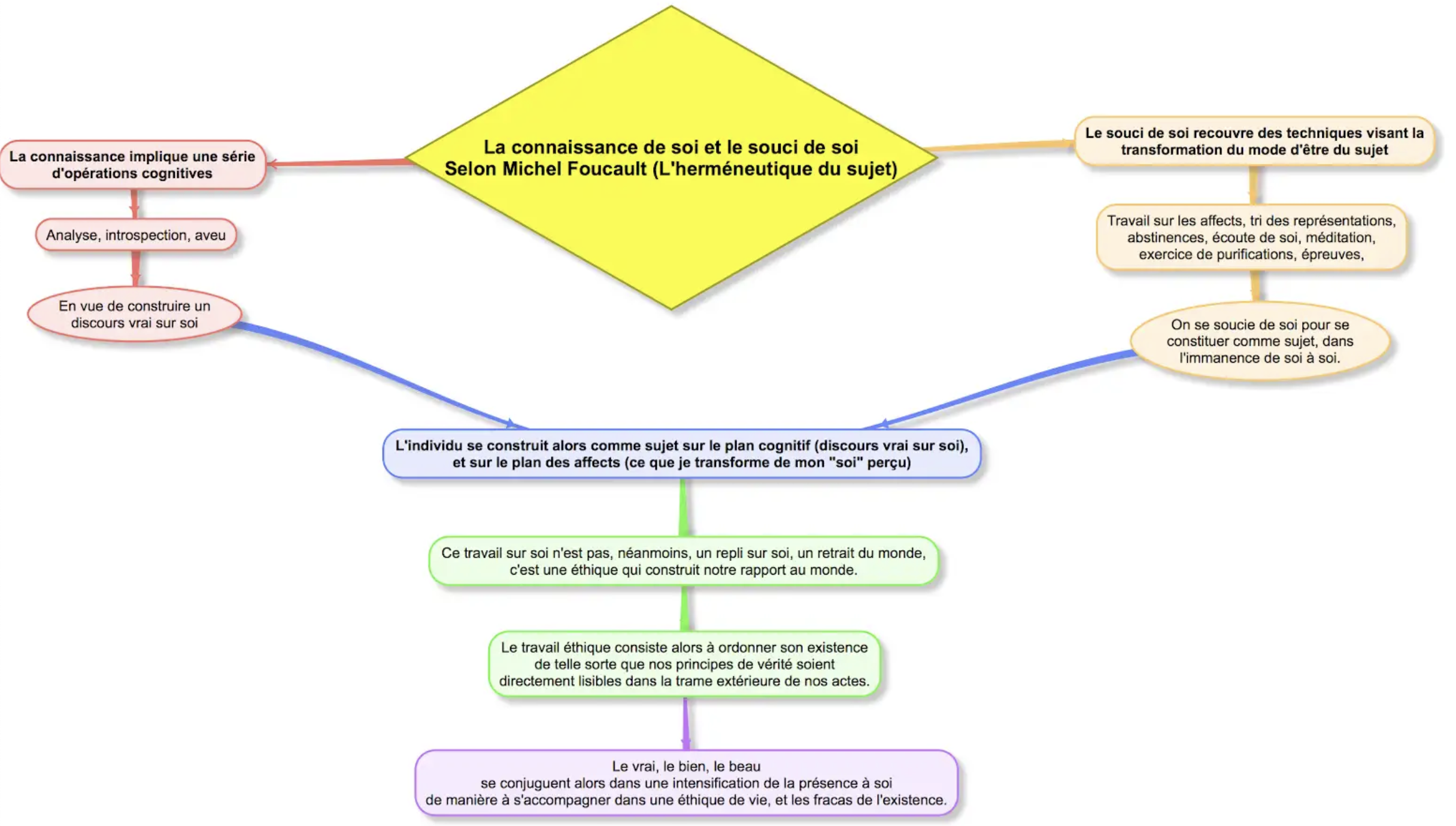 La connaissance de soi implique une série de techniques cognitives ( examen, introspection, aveu, etc.) permettant au sujet de se poser comme objet d’un discours vrai sur lui-même. C’est le problème du « qui suis-je ? », et de l’identité personnelle à conquérir. Le souci de soi recouvre, quant à lui, un ensemble de techniques concourant à la transformation du mode d’être du sujet, au moyen de pratiques réglées de vérité (purifications, épreuves, tri des représentations, abstinences, etc.) . L’individu se construit ici comme sujet en se posant la question « que faire de mon existence ? ». C’est le problème de la vie comme œuvre à accomplir.