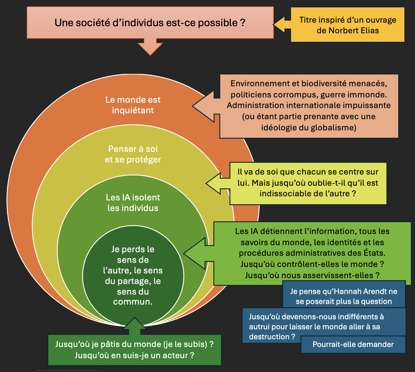 La prochaine fois, peut-être vaut-il la peine que nous nous efforcions de formuler une problématique à un quart de temps du débat, que nous la cherchions ensemble. Qu’en pensez-vous ? Essayons et explorons des approches pour faire évoluer les manières de débattre dans ce groupe.Je reviens à notre débat. A la suite de cette exploration, nous avons été conduits à nous demander si nous étions en mesure de vivre ensemble (de former du commun) dans un monde hyper-individualisé ?